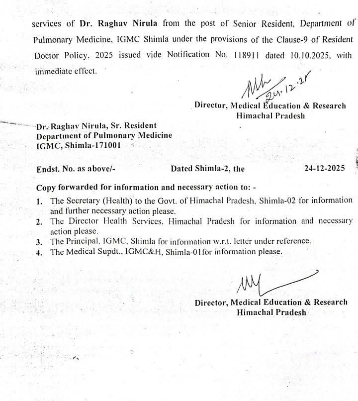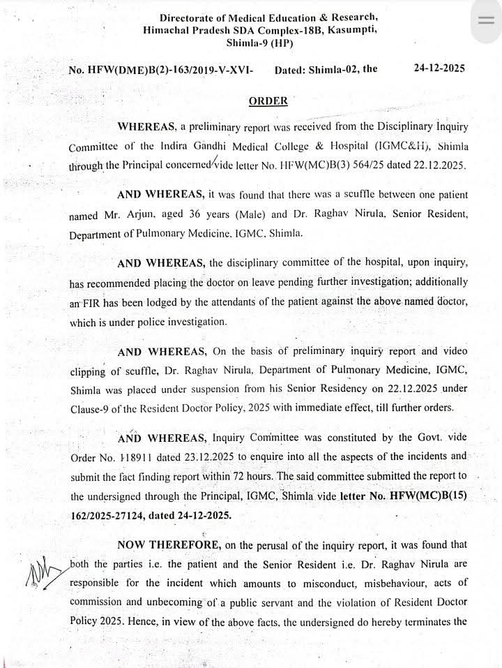 शिमला। हिमाचल प्रदेश के शिमला स्थित इंदिरा गांधी मेडिकल कॉलेज (IGMC) शिमला में मरीज के साथ हुई मारपीट की घटना को लेकर हिमाचल प्रदेश सरकार ने सख्त रुख अपनाते हुए बड़ी प्रशासनिक कार्रवाई की है। चिकित्सा शिक्षा एवं अनुसंधान निदेशालय, हिमाचल प्रदेश ने पूरे मामले की जांच पूरी होने के बाद आरोपी सीनियर रेजिडेंट डॉक्टर राघव निरुला की सीनियर रेजिडेंट सेवाएं समाप्त करने के आदेश जारी किए हैं।